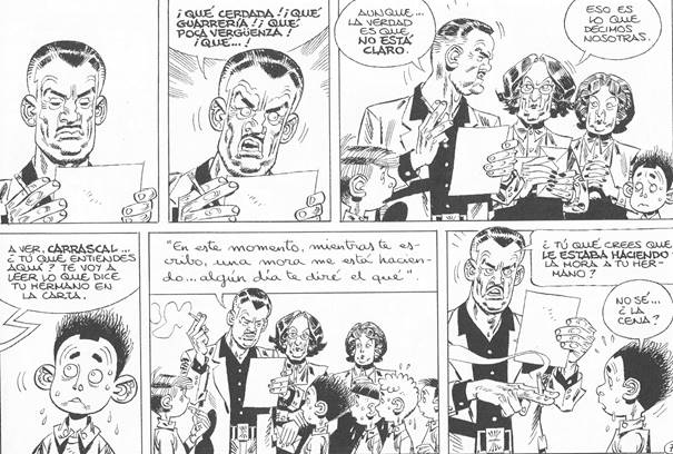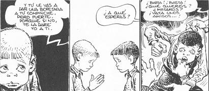 Pero el caso más interesante de violencia en el cual hay que detenerse un poco más es el de la violencia simbólica10. Muchos de los niños son hijos de republicanos fallecidos durante la Guerra Civil, ya que, cuando fue creado en 1936 por Mercedes Sanz Bachiller, el entonces llamado Auxilio de Invierno tenía como finalidad dar una solución al creciente número de huérfanos producidos por la Guerra Civil y los bombardeos. Así, el centro estaba animado por un “esprit de vengeance aigüe”11 para con estos niños que representaban a los vencidos de la guerra, reproduciendo, pues, la filosofía de la victoria desarrollada por Franco12. En efecto, en el episodio “Noche de Reyes” (Paracuellos 1) se nos presenta la explicación de la presencia de los niños en el centro pedagógico de Paracuellos de Jamara. El encadenamiento de las distintas viñetas sin espacios entre ellas es una especie de panorama de la España franquista de posguerra. Observamos la trascendencia de la orfandad (Modesto) por culpa del fallecimiento de los padres en la guerra; la presencia de la enfermedad (Carlos, representación de la historia del propio Giménez desarrollada en “Los Nuevos”, en Paracuellos 2) con su parangón, la tuberculosis13; el encarcelamiento de los padres rojos con Rudy, sin olvidar que el padre de Adolfo Martínez Carrillo fue encarcelado por lo del “estraperlo”14 (“había que vivir, ¿no?”). De ese modo, Giménez ofrece un verdadero panorama sociológico de los vencidos de la Guerra Civil.