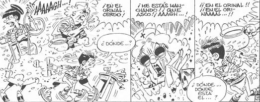 En cuanto a la violencia física, además de los golpes ya evocados, se añaden el hambre y la sed, necesidades vitales que los niños no pueden satisfacer por estar privados voluntariamente de ellas por parte de las guardadoras5. Esas realidades históricas son tanto más patentes en la lectura cuanto que Giménez las representa mediante “imágenes semantizadas”6, es decir, imágenes que tienen un impacto emocional muy fuerte. Pensamos en Toñín, apodado “Cagapoco” (Paracuellos 3), quien, desde su llegada al hogar, no ha podido defecar y le duele la barriga. Las enfermeras escogen darle “agua con jabón” con una perfusión en los glúteos para “suavizar y dejar el intestino lubricado”. La otra enfermera tiene miedo de que el líquido no entre y el niño reviente. Siguen con la perfusión, pero la ventosidad sale, manchando a las enfermeras.