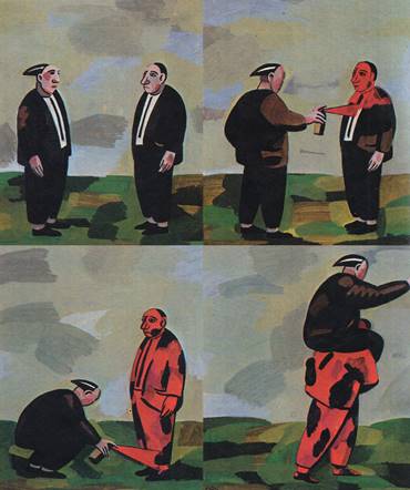 Asimismo, en “Cartas” (Paracuellos 3) la orden de la guardadora (“¿Por qué escribes Jiménez con J? Jiménez suena mejor con G: Giménez. A partir de ahora escríbelo siempre con G. ¿Has oído?”) remite a la misma estrategia: renombrar es adueñarse de lo nombrado, es operar la transformación del rojo que pretende el franquismo, siguiendo las ideas de Vallejo-Nájera. Este caso merece más precisión: el hecho de que la letra “G” se prefiera a la “J” se explica por las connotaciones gitanas del apellido con “J”, que el franquismo deseaba eliminar18. Nos recuerda la obra “La Guerra Civil” de Ops (Andrés Rabago García)19, en la que vemos a dos hombres cara a cara, uno pinta al otro de rojo, se le sube a la espalda y se van. Retomamos la explicación límpida de Michel Matly: “La parábola es clara. Una parte de España se ha esforzado en calificar a la otra como ‘roja’ para dominarla mejor”20. Las guardadoras hacen perder la identidad a los vencidos, para que puedan “habitar sin conflicto en la dictadura”21.