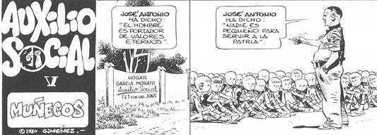 Esta larga enumeración ilustra hasta qué punto el adoctrinamiento era fuerte. La sucesión de imágenes de la vida cotidiana sin espacios interviñetales plasma cuán agobiante resultaba esa vida para esos “hombrecitos”. Asimismo, el patriotismo exacerbado queda ridiculizado en toda la obra. Lo notamos, por ejemplo, en “Muñecos”, cuando Antonio repite varias frases de José Antonio Primo de Rivera con la mismísima formula (“José Antonio dice que…”). Dichas sentencias remiten siempre al porvenir de la nación y a mostrar que estos niños en transformación se inscriben en la ideología imperial de España: “Nadie es pequeño para servir a la patria"; “España es una unidad de destino en lo universal". También, el himno falangista “Cara al sol” es seguido al pie de la letra, ya que duermen la siesta ‘cara al sol’. Esta imagen surte un efecto chocante, ya que los niños nos hacen pensar en fotos de cadáveres puestos uno al lado del otro. Así, todo el programa de Vallejo-Nájera para los adultos tuvo su aplicación a esos “hombrecitos”, lo que denota la concentración de los elementos franquistas dentro de este espacio carcelario reducido.