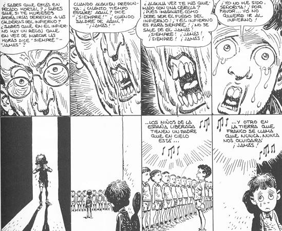 Así, las violencias se mezclan: una violencia física puede ser a la vez moral y simbólica. Forma un microcosmos de represión, un pequeño espacio, agobiante y opresivo para niños que son hombres pequeños, “hombrecitos”, como dice Carlos Giménez. Pero Paracuellos da cuenta de la represión franquista en su conjunto: la propaganda del régimen y las tentativas de transformación de los desafectos estructuran el relato. Como afirma Ricard Vinyes, retomando las ideas del psiquiatra franquista Vallejo-Nájera en Eugenesia de la hispanidad y regeneración de la raza (1936), si el Movimiento Nacional se puso en marcha fue por la necesidad de rectificar la acción de un adversario histórico, persistente, astuto y mutante, un liquidador de los valores definidores de la Hispanidad, valores a los cuales Vallejo-Nájera denominó “complejos afectivos básicos”22. En concreto: religiosidad, patriotismo y responsabilidad moral, vinculados a ideales éticos y al “yo ideal”. Vallejo-Nájera diferenció dos terapias distintas para purgar el “gen rojo: el adoctrinamiento religioso y patriótico para los adultos; la segregación del ambiente familiar nocivo para los niños. Pero, como subraya Carlos Giménez en el título de uno de los episodios del segundo volumen, esos niños son “hombrecitos”. Es decir, hombres en devenir, pero también hombres en miniatura23. De ahí que sufrieran una doble pena: el aislamiento de sus padres y el adoctrinamiento religioso y patriótico.