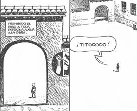 Esta sensación de encierro vista desde dentro del hogar por los niños destaca en la construcción misma de las historias de Giménez. Pocas veces salimos del espacio del hogar. Un episodio notable en este sentido es “Tito” (Paracuellos 1), en el que Tito se pasea con su hermano menor Giménez y aparecen aves como símbolos de una libertad imposible para el pequeño Carlitos. El final de esta historia es representativo de las demás: hay un efecto de trávelin en picado para ilustrar la soledad del niño, solo en medio del patio después de la salida de su hermano. Muchos episodios se acaban con este efecto para dar una visión panorámica del hogar que ilustra el encierro cotidiano (pensamos en “Soldaditos”, en Paracuellos 6, cuando Hormiga está solo bajo la nieve y su padre se va con los soldaditos que el niño les robó a sus hermanos). Solo se perciben las puertas del exterior, nunca el exterior en sí. Esa situación es semejante a la que muchos españoles experimentaron fuera del hogar: como subrayan Jorge García y Fidel Martínez en la historieta “Entre rejas” de Cuerda de presas, “al pisar aquella España imperial supe que las rejas venían conmigo”38. Como en Cuerda de presas39, en Paracuellos estamos en un dispositivo de cárcel literario: las arquitecturas narrativas cerradas nos colocan en el mismo sitio que los niños en esos hogares y entonces no podemos ver más allá, estamos encarcelados y sufrimos con los niños los padecimientos injustos. Como dice Jacqueline Sabbah, “los relatos de Cuerda de presas, por su estructura y recursos gráficos y narrativos, configuran un espacio de lectura que reproduce en el lector lo experimentado por las presas”. También en Paracuellos la arquitectura del pensamiento de los niños se plasma estilísticamente.