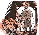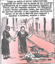 El malestar se plasma en los rostros de los violentados, como esta mujer esposada cuyos ojos ya no son puntos sino líneas horizontales como la desesperanza (fig. 9) o ese hombre apuntado por una pistola y una sonrisa sádica, en cuya cara se lee el terror y el asombro71. Un asombro similar se adivina en el rostro del poeta García Lorca cuando sale detenido entre dos guardias civiles72 mientras que el anciano Damián Ordóñez, que no puede moverse, se atreve a plantarles cara literalmente a los requetés armados que pretenden detenerlo73. También los interrogatorios y las torturas dejan su huella, por ejemplo, en el rostro sudoroso y anonadado del periodista López, encerrado en un calabozo por criticar a un torero74. Las mujeres, además de ser torturadas75, padecen a menudo la violencia de género, normalizada por la sociedad franquista76, e incluso violaciones, ya sea por legionarios y moros animados por el general Queipo de Llano (fig. 10), ya sea por los carceleros77.