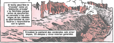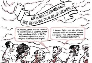Bastante más humorístico resulta el metarrelato imaginario, sacado de las ensoñaciones del doctor, insertado al final de Un médico novato, en el que una fila de fusilados, que va creciendo, comparece ante Dios, quien les pregunta por qué los falangistas tienen tanto interés en traerlos hasta él, y por qué son cómplices los sacerdotes55. En este diálogo de cinco páginas, el hermano del protagonista le responde con lógica cristiana y fingida ingenuidad, denunciando con subversión los crímenes de los militares y los sacerdotes que “han constituido una sociedad: La Cruz y la Espada, cuya finalidad es defender los intereses de los banqueros” (fig. 8).