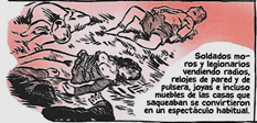 Primero se reflejan las mentiras que los franquistas difundían acerca de los vencidos republicanos para justificar su represión: por ejemplo, al dibujar un libro antirrepublicano de 1937, The second and third reports on the communist atrocities, y reproduciendo la parte final en mayúsculas (“COMMUNIST ATROCITIES”) para poner de relieve “la habilidad con que los franquistas hicieron circular historias tremendamente exageradas, y a menudo ficticias, del desorden en los pueblos del sur”, hasta tal punto que el delegado de Propaganda Antonio Bahamonde “huyó de Sevilla asqueado por las mentiras que se había visto obligado a difundir”59. No solo aparecen estas mentiras en la tonalidad descriptiva de La Guerra Civil Española, sino también en el diálogo entre un hijo y su madre cuando presencian el regreso de los reclusos al campo de concentración. El niño se pregunta si de verdad son comunistas porque “no les [ve] ni el rabo, ni los cuernos”60.