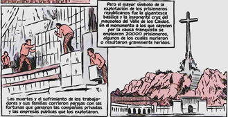Otro espacio de reclusión importante en estos cómics es el campo de concentración franquista, donde los presos solían ser sometidos a trabajos forzosos, aunque también lo eran en algunas cárceles96. Por supuesto, estas viñetas no dejan de aludir a los campos de exterminio nazis, donde fueron deportados miles de republicanos españoles97 (unos 5.000 fallecieron en Mauthausen) y a los campos de internamiento franceses, ya sean los de la Retirada en el sur del país (como en El ángel de la Retirada de Paco Roca)98, ya sean los que Francia tuvo en África99. Pero los campos franquistas, más desconocidos aún que las cárceles (tanto los de clasificación improvisados100 como las posteriores Colonias Penitenciarias Militarizadas por donde habrían pasado más de 400.000 presos)101 han ido apareciendo cada vez más en el cómic de los últimos años. El más destacado seguramente sea el de Cuelgamuros, cerca de Madrid, donde se construyó el mausoleo del dictador Franco. Su basílica e imponente cruz es “el mayor símbolo de la explotación de los prisioneros republicanos” (fig. 14). La yuxtaposición de la viñeta en la que cuatro presos, en contrapicado, desplazan bloques de piedra, junto a la del propio edificio, que así queda reducido al mismo tamaño que estos épicos esclavos, pone de relieve el trabajo peligroso de estos 20.000 hombres.
