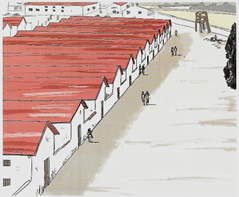 También se dedica una novela gráfica entera, Esclavos de Franco, a la explotación de los republicanos que redimían un año de condena por cada mes de supervivencia dócil en estas condiciones103. El protagonista, condenado a construir carreteras en la frontera pirenaica, se enfrenta a vigilantes incompasivos y a una (de)gradación de las condiciones climáticas: primero, el lector lo observa picando piedras bajo un calor sofocante y sin agua104, luego bajo una lluvia que le provoca una herida105 y finalmente, en el clímax de la novela, en medio de una nieve asesina a la que sobrevive de milagro106. La fragilidad de la vida en estos barracones queda de manifiesto en la contraposición de dos dibujos en picado del destacamento: uno, al principio del relato, que insiste en su inmensidad y en su sobreexposición a la luz, con un punto de fuga hacia el ángulo superior derecho (símbolo de un futuro imprevisible), y otro, al final, en la oscuridad de la noche, en que un techo queda derrumbado bajo la nieve (fig. 15 y 16).