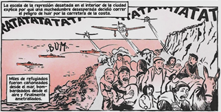 Nos detendremos más detalladamente en el tratamiento gráfico de los cuerpos de las víctimas, ya que también participa del pathos gráfico para persuadir al lector desde las emociones. Si bien se utiliza la reiteración de onomatopeyas ("¡Bang!") sin cuerpos para representar los fusilamientos en masa, también se representan cuerpos sin sonido, caras que gritan sin grito, para evocar el terror. Lo vemos en especial en la viñeta que sintetiza la masacre de la “Desbandá” por la carretera de Málaga a Almería en 1937. Aquí, ninguna onomatopeya es capaz de transmitir el miedo de estos civiles, blancos de la aviación y los barcos del Eje, simultáneamente, que sí están acompañados de ruidos onomatopéyicos (fig. 18).