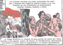 Asimismo, encontramos expresiones parecidas para acompañar los testimonios ‘fidedignos’ sobre el bombardeo de Guernica: una mujer, en el centro del dibujo, a la que intenta alcanzar la mano de un niño, queda encerrada en sí misma, con la boca abierta y los ojos tristes, pero su grito inaudible está relegado al cartucho que reproduce un artículo del padre Alberto Onaindía en The Times: “El fuego envolvía la ciudad. Se oían gritos de dolor por todas partes”129. Por el contrario, en Esclavos de Franco, Julián recuerda el bombardeo de su pueblo, en el que teme por sus padres: en ese caso, el primerísimo plano de sus ojos, acompañado por el bocadillo “¡No!”, muestra al lector (espectador al igual que el protagonista) un grito sin boca130.