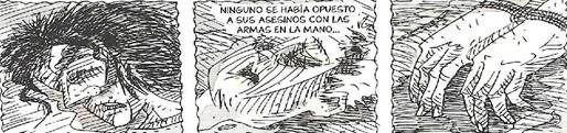 Para culminar esta tipología de la represión física franquista, podemos explorar el espacio de la muerte, ese lugar fronterizo entre las sacas y las fosas, ese instante de la ejecución entre la vida y la muerte que el cómic logra inmortalizar en una o en varias viñetas112 que reconstruyen en una secuencia el acto de matar en movimiento113. En El Violeta la progresiva puesta de sol acompaña durante dos páginas el intento de estrangulación por el franquista (cuyas onomatopeyas y cuyos ojos en primerísimo plano refuerzan la tensión de la escena) del detenido discapacitado, que se ha comido una patata cruda114. El principal símbolo de estas ejecuciones suelen ser los fusiles con los que apuntan guardias civiles o falangistas, puestos de relieve por su horizontalidad en el encuadre115, aunque en ocasiones también maten con arma blanca116.