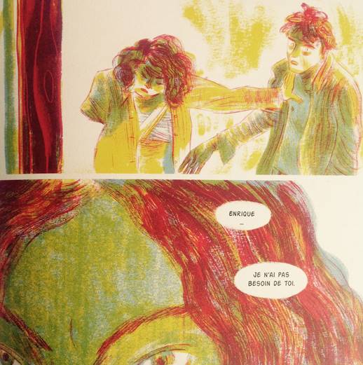 De la même manière, les querelles politiques entre féministes sont souvent mal traitées, avec un manque de finesse, ou tout simplement montrées comme des points d’intrigue inintéressants. Nous remarquons la question de la lutte pro ou anti-abolition de la prostitution dans Au cœur du rêve104, pour ou contre l’avortement dans Insoumises105, ou du rapport de force entre féminisme et lutte des classes chez certaines militantes dans Double 7106. Chaînes aborde l’opposition entre les militantes communistes et celles des autres groupes. Mais tout cela reste la plupart du temps très anecdotique. Tout comme le récit des répressions particulières contre les femmes durant le franquisme, abordé largement dans Chaînes, mais qui sinon souvent absent des histoires, à part une case sur les femmes tondues dans Des espaces vides107.
