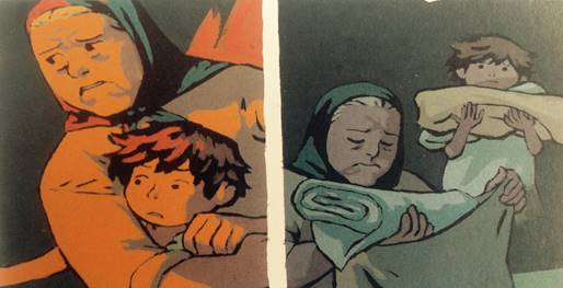 Fig. 7. Maria prend soin de sa petite fille en fuyant le village dans Seule