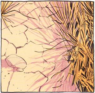 La sécheresse est un des éléments les plus récurrents de la description du paysage dans Intempérie. C’est également le thème de la deuxième vignette qui représente en gros plan un fragment de sol craquelé par l’aridité. Quelques herbes desséchées peinent encore à y pousser mais elles annoncent déjà l’infertilité du sol, la désertification, l’exode et l’abandon des villages. Le texte qui accompagne le dessin corrobore cette perception de paysage dans lequel plus rien ne pousse. Les terres fertiles ont laissé la place à de la glaise. Le vert de la végétation n’est plus qu’un souvenir effacé par la couleur cramoisie de la sécheresse. Le sol n’est par endroit que poussière. Il n’y a plus que des cailloux pour rompre la monotonie de la platitude. Il est intéressant d’ailleurs de remarquer que la sécheresse n’est évoquée que par des éléments liquides : « une mer de céréales baignait la plaine, les épis ondulaient comme la surface d’un océan, vagues vertes et parfumées. » Toutes ces métaphores n’ont d’autre fonction que d’accroître le sentiment d’hostilité causé par le manque d’eau.