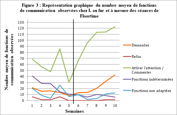 Concernant l’élaboration des fonctions de communication (figure 3), nous pouvons observer une diminution des fonctions de communication indéterminées et non adaptées à la situation, concomitante à une évolution notable des communications dont la fonction est d’attirer l’attention/commenter. Une plus grande intentionnalité de communication avec autrui semble observable.