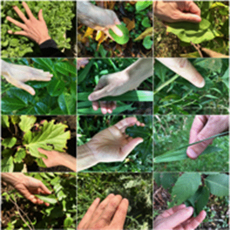 Selon la taille et la forme des feuilles (ou groupe de feuilles), une chorégraphie de la main s’impose. De mini-séquences concernant différentes parties végétales peuvent se succéder pour en explorer toutes les caractéristiques. Dans le cas d’une feuille moyenne, les cinq doigts permettent de saisir la feuille, mais seul le pouce effectue le toucher en mouvement.