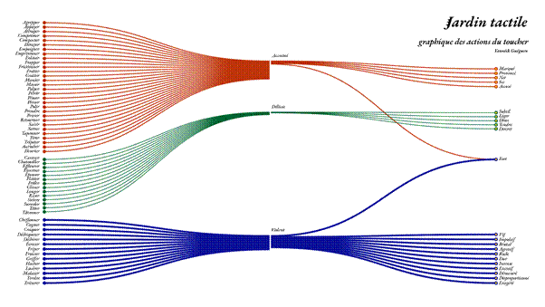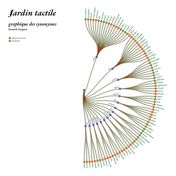 Dans le cas du Jardin tactile, les outils graphiques permettent d’aller interroger un milieu végétal, de structurer la recherche pour récolter des informations sensorielles. Ils sont utilisés pour réduire l’écart entre données rationnelles et données sensibles. L’une et l’autre ne sont plus en opposition.