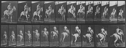 Le tournant des années 1880 est marqué par l’invention et le développement de la photographie instantanée. Dans cette période Étienne-Jules Marey a inventé la prise de vues en rafale au moyen du fusil photographique qui permet, lors de projections à l’Académie des sciences dès 1882, de saisir les mouvements du vol des oiseaux, par exemple avec Pélicans volants sur plaque fixe. Aux États-Unis, à Philadelphie, un volume comportant de très nombreuses séries de photos successives, prises par Eadweard Muybridge, est publié en 1887 sous le titre d'Animal Locomotion1. Il constitue un répertoire de mouvements à valeur scientifique, pour saisir la décomposition des actions, mais il est aussi destiné au travail des peintres et permettait ainsi de percevoir les étapes du galop d’un cheval, imperceptibles à l’œil nu (Fig. 1) et (Fig 2). En 1891, un brevet, portant sur l'animation d'images photographiques et la fabrication réussie d'une première caméra argentique, est déposé par Edison et Dickson. Le film Dickson Greetings (1891)2 qui fixe le mouvement du bras d’un homme, a pu être considéré comme le tout « premier » film. D’une durée initiale de 10 secondes, il est réalisé au Kinétographe, avec un film de 19 mm, à six perforations rectangulaires arrondies en bas de chaque photogramme, dans un format remplacé, dès 1893, par le 35 mm3. L’invention du « cinématographe »4 des Frères Lumière a lieu avec une première projection en 1895.