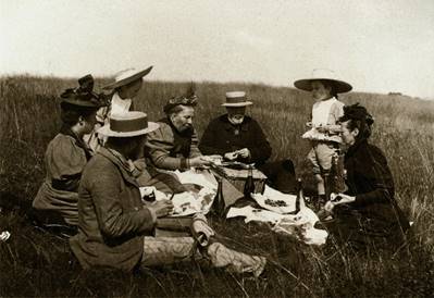 Fig. 12. Martial Caillebotte. Dejeuner sur l’herbe de la famille Caillebotte (Maurice Minoret, Marie et Geneviève Caillebotte, Marie et Camille Minoret, beaux-parents de Martial Caillebotte, Jean Caillebotte, fils de Martial et Marie Caillebotte, Joséphine Fléchon). Carte postale.