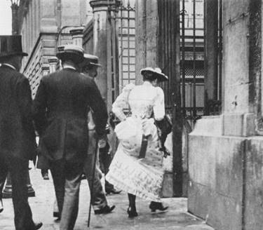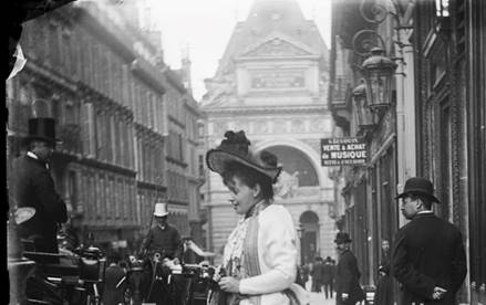 Fig. 9 : Joseph Primoli. Réjane, rue Rougement (à gauche), devant un restaurant,