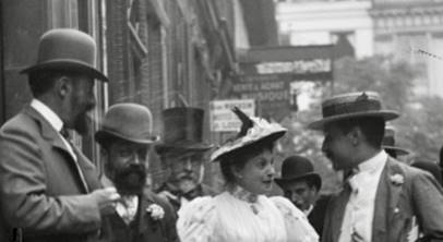 Le mouvement, dans notre corpus, est en premier lieu porté par le fiacre et par la rue, ces deux chronotopes de la modernité qui disent la vitesse et la fugitivité. Mais le mouvement, c’est aussi celui des corps flous des passantes et des passants (Fig 5, à l’arrière-plan), c’est également tel « morceau » de corps flou qui suggère un geste (Fig. 18, l’homme au mouchoir à l’arrière-plan) : une main, un pied. Le mouvement arrêté des corps les rend ainsi fantomatiques, presque fantastiques. Si l’on concentre à présent notre regard sur Réjane et les hommes qui l’entourent, Primoli les a saisis en train de marcher, de manger, de regarder, de bavarder. Le photographe capte des fragments d’actions en train de se dérouler et produit ainsi un effet « arrêt sur images » très suggestif. Car l’instantané suggère le mouvement et appelle projections et fantasmes en stimulant l’imaginaire : de quoi parlent-ils ? où vont-ils ? que mangent-t-ils ? que lui dit-il pour qu’elle rie ainsi ? Profondément narrative, la photographie instantanée concentre des micro-récits potentiels que le spectateur projette sur une action silencieuse, qui échappe au regard et sur laquelle il achoppe. Cette dimension narrative de l’instantané ne remet pas du tout en question sa force iconique, bien au contraire.