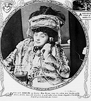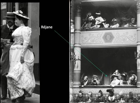 [15] Concernant les quatre autres photographies, pour l’une d’entre elles, il semble très probable qu’il ne s’agisse pas de Réjane. Pour les autres, le doute demeure : la silhouette féminine est bien plus mince que Réjane, mais on peut reconnaître la forme de ses sourcils. Ce qui perturbe en l’occurrence, c’est que son sourire laisse deviner ses dents. Le doute n’étant pas levé, j’ai restreint le corpus aux vingt photographies dont je suis sûre.
