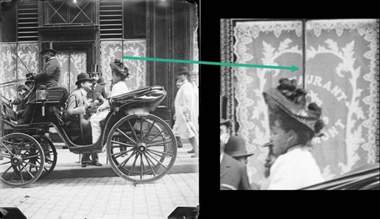 Une photographie, prise dans la salle, nous le confirme (Fig. 8) ; elle y porte la même robe à ceinture épaisse et le même chapeau blanc que rue Rougemont. Contrairement à l’indexation de la Fondation Primoli, nous n’avons pas affaire à une série mais à deux, composées cependant du même trio : Réjane, Louis Ganderax et le photographe, Primoli, grand ami du critique. Réjane a-t-elle changé de toilette entre deux sessions du concours ? C’est peu probable. Ces photographies correspondent sans doute plutôt à deux jours différents, l’un au concours du Conservatoire, l’autre à un déjeuner au restaurant Rougemont comme l’inscription tronquée sur la devanture (Fig. 9 et 10) le laisse deviner. Bien qu’on ne puisse pas tout à fait résoudre l’identification temporelle de ces photographies, leur valeur documentaire est exceptionnelle. Elles témoignent de ces nouveaux sujets et de ces nouvelles manières de voir qu’implique le développement de l’instantané6.