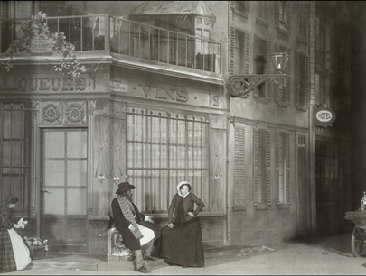 C’est dans ce contexte qu’André Antoine fonde en 1887 le Théâtre-Libre, premier théâtre « à côté »21 du XIXe siècle, où sont joués de jeunes auteurs et prônés un jeu naturel, des décors réalistes, bref, un théâtre plus vrai, dans la droite ligne du Naturalisme au théâtre (Charpentier, 1881) d’Émile Zola. Cela passe notamment par le refus de la déclamation ampoulée du Conservatoire, par le rejet du jeu artificiel à l’avant-scène, face au public, et par la fin des toiles peintes en fond de scène. Rénovateur important de la fin du siècle, Antoine a encouragé le jeu de dos, une gestuelle et un parler au plus près de la vie ordinaire22. Jean-Pierre Sarrazac a résumé en une phrase l’apport d’Antoine à l’histoire du théâtre : « Une troupe inventant sur fond de simplicité, de véridicité – de “quotidienneté”, pourrait-on dire –, la grammaire moderne de l’acteur dans sa version réaliste »23. Or cette invention scénique et dramatique a évidemment à voir avec l’apparition de l’instantané, lequel permet de saisir les individus et les groupes sociaux dans leur quotidienneté, et la société dans la multiplicité de ses visages, de ses rythmes et de ses espaces. Cela est aussi vrai pour les décors naturalistes, pensés comme le résultat de l’observation d’après nature. En témoignent ces deux photographies dont la similarité est fascinante (Fig. 22 et 18) : d’un côté, une photographie de Germinie Lacerteux, représentée à l’Odéon en 1888 avec Réjane dans le rôle-titre ; de l’autre, l’une des photographies de Primoli.
