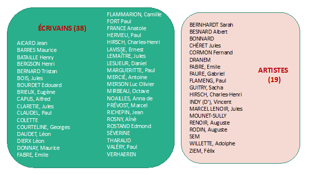 Mais qui sont les 57 sujets photographiques partagés par les collections photographique et cinématographique ? En voici la liste, qui se divise en deux catégories générales : les artistes (peintres, sculpteurs, comédiens), au nombre de 19, et les écrivains (poètes, romanciers, dramaturges), au nombre de 38 (Fig. 2).