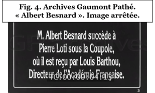 Si ce corpus laisse sur le bas-côté un certain nombre de figures dont l’absence est partiellement due, pour 15 d’entre elles, à une incompatibilité historique avec les débuts du cinématographe (Renan, Verlaine, Mallarmé, Sarcey…), la proportion des bénéficiaires de la double expérience photographique et cinématographique y est tout à fait significative, puisqu’un peu plus de 30% des écrivains et artistes immortalisés par Dornac expérimenteront le cinématographe. On peut même établir, quantitativement et qualitativement, que le passage du « portrait Dornac » au « portrait Pathé » relève davantage du fondu-enchaîné que de la rupture iconographique, et ce pour deux raisons. La première est chronologique. Dans la plupart des cas en effet, notamment pour des raisons techniques, les apparitions « Pathé-Gaumont » sont postérieures aux saisies photographiques de Dornac, ainsi que le révèle la juxtaposition des visages photographiés puis filmés, tels ceux, touchants et vieillissants, de Camille Flammarion (Fig. 3a et 3b)6, plus « photogénique » dans un gros-plan cinématographique que dans la capture photographique de sa dilution parmi les objets du quotidien : ce sont donc les « outrages du temps » qu’il est donné d’observer dans les corps penchés ou les têtes blanches des grands de ce monde, ou bien encore les processus biographiques de consécration institutionnelle qui viennent couronner une longue carrière. Ces derniers établissent une transition non seulement externe, entre les séries photographique et filmique, mais également interne, au sein du seul corpus filmique, le ballet des scènes d’entrée à l’Académie française scandant la disparition de l’un et l’entrée de l’autre : En 1924, Albert Besnard succède ainsi au défunt Pierre Loti (Fig. 4)7, de même qu’en 1922, Bergerat a remplacé Paul Margueritte à l’Académie Goncourt et ainsi de suite, la scène d’intronisation académique inscrivant le portrait filmé dans le régime patrimonial et continu de la transmission. Mais de la série photographique à la cinématographique, le fondu-enchaîné est également esthétique, un certain nombre de portraits filmés prolongeant les scénographies des objets mises en place par Dornac, avec leur lexique et leur syntaxe précis.
