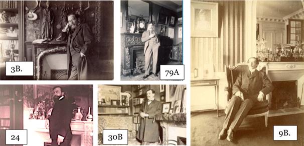 Fig. 12. De l’art d’habiller une cheminée. Dornac, Nos contemporains chez eux, respectivement Jean Aicard (CODML, 3B), Jules Bois (24), Maurice Donnay (79A), Paul Bourget (30B), et Maurice Barrès (9B). Coll. part.