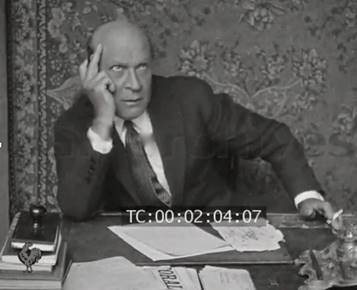 Une troisième série de cas est celle de la situation oratoire, qui nous confronte à cette scène si étrange, et cependant si fréquente dans les séquences filmées : le sublime sans objet de la déclamation muette et de l’éloquence supposée. C’est le cas avec Jean Aicard, ou bien Tristan Bernard (Fig. 30)28, dont l’éloquence, qui se déploie dans un décor minimaliste réduit à deux objets, ou même à rien, concentre toute l’attention sur une parole dont le flot est porté par l’articulation appuyée de la mâchoire et de la gestuelle : de ce mutisme paradoxal résulte une conscience d’autant plus aiguë de la force poétique du sujet qu’elle se pratique in absentia, épurant et sublimant un texte non plus écouté, mais deviné sur les lèvres, et en définitive, imaginé.