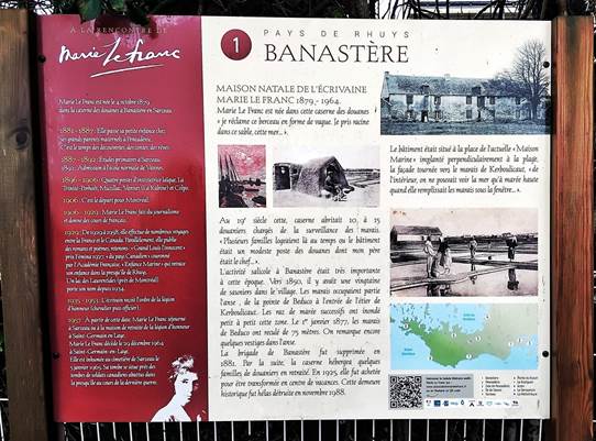 Cette proposition entre deux rives consacre l’attachement de Marie Le Franc à ses deux patries et son amour du voyage qu’elle a nourri tout au long de sa vie. Dans le Morbihan, dix panneaux d’interprétation constituent une balade littéraire intitulée : Sur les traces de Marie Le Franc.