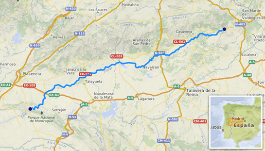 Comme dans tous les contes, la localisation spatiale de l’histoire contée reste souvent imprécise pour favoriser la déréalisation : « dans un petit village d’Estrémadure (« en un pueblino de Extremadura ») indique l’incipit de « La flor de Lililón », recueilli dans la zone montagneuse de La Vera, au nord-ouest de la province de Cáceres, zone célèbre pour son patrimoine naturel et historique. Le conteur ancre son récit dans une réalité géographique tangible, concrète, repérable, et intègre des référents familiers ou connus de l’auditoire, tel, dans le cas de ce conte précisément, la mention vague de la zone au nord du fleuve du Tiétar, affluent du Tage (Fig. 11), où se situerait ce petit village du conte dans lequel le couple royal y séjournait longuement pour la chasse (peut-être s’agirait-il selon notre repérage de Madrigal de la Vera ou de Villanueva de la Vera).
