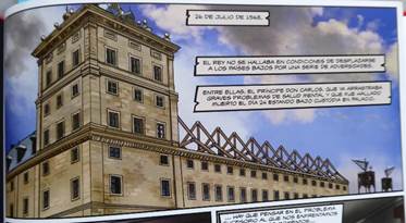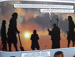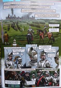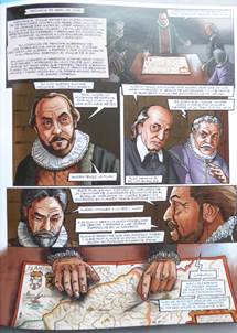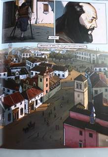 Si le décor de la ville est déterminé par le quartier où habite Juan de Olite, ce qui frappe dans la vue de Madrid, légèrement en plongée, c’est la présence très marquée des espaces religieux. Pas moins de trois campaniles et deux croix apparaissent dans la vignette qui occupe plus de la moitié de la page comme pour signifier l’importance du répérage spatial dans l’ouverture du récit. Cette empreinte religieuse, rehaussée dans l’encadré par la mention de la date suivie de « nuestro señor » introduit le point de vue espagnol de la défense du catholicisme en ces premiers temps de la Contre-Réforme dont Philippe II, suivant sa vision messianique, se fit le champion en promulgant les décrets tridentins, dès 1563, comme lois de ses royaumes. Le ton est donné dès la première page de la bande dessinée : cette identité religieuse inaugure la perception du temps. La guerre des Flandres sera abordée à travers les enjeux et les intérêts espagnols tels que le prédicateur catholique Lorenzo de Villavicencio le rappelle au roi le 6 octobre 1566 :