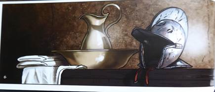 Antonio Gil nous invite à pénétrer le passé de son personnage dont on comprend l’expérience de combattant à partir de la 7e vignette9 où, de façon étonnante, à côté d’une bassine et d’une cruche, objets de toilette se référant à la vie intime, un casque espagnol trône comme pour signifier la hantise du souvenir de la guerre dans son quotidien. L’élément de l’armure, symbole de la puissance militaire et de la reconnaissance sociale, est à l’arrêt comme son propriétaire, condamné à rester à l’intérieur d’une maison, au repos, loin des champs de bataille. Le pathétisme s’installe et la focalisation interne se précise encore, quand, quatre vignettes plus loin, le soldat déchu observe avec gravité les jeux innocents d’enfants simulant la guerre. La nostalgie du temps de l’insouciance naît en lui quand apparaît simultanément un visage de soldat muni de sa lance, tous deux baignés de sang.