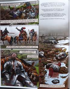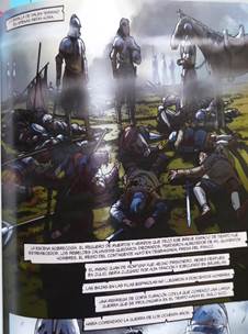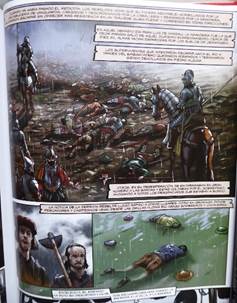 « Heiligerlee sería recordada como una humillante derrota para los españoles »17, les vignettes montrent en gros plan la désolation de l’échec du camp espagnol avec un sol jonché de cadavres. La nature dévastée souligne l’ampleur du désastre militaire. La boue mélangée au sang offre un terrible spectacle de mort qui bouche l’horizon d’une brume épaisse de désespoir. L’espace est représenté en accord chromatique avec la situation déplorable des personnages.