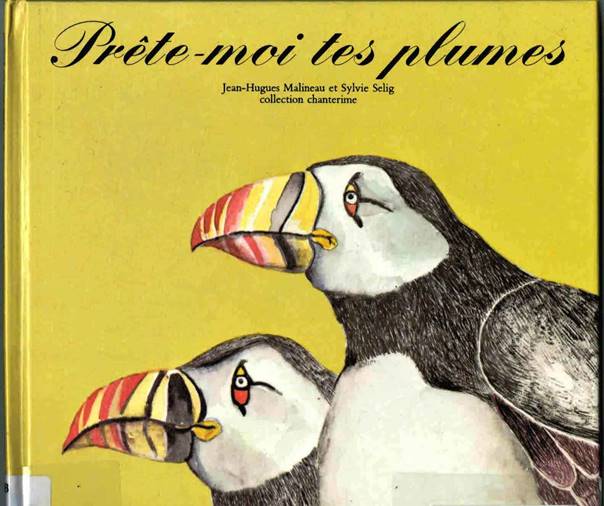 Illustration 1. 1re de couverture de Jean-Hugues Malineau, Prête-moi tes plumes, ill. Sylvie Selig, École des loisirs, coll. « Chanterime », 1978.
