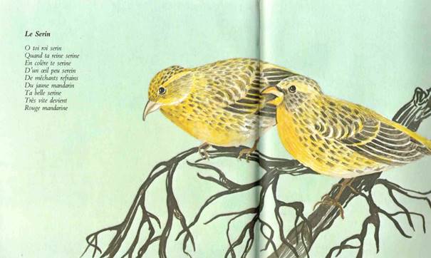 Illustration 3. Jean-Hugues Malineau, Prête-moi tes plumes, ill. Sylvie Selig, École des loisirs, coll. « Chanterime », 1978 : « Le Serin »