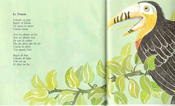 Illustration 4. Jean-Hugues Malineau, Prête-moi tes plumes, ill. Sylvie Selig, École des loisirs, coll. « Chanterime », 1978 : « Le Toucan »