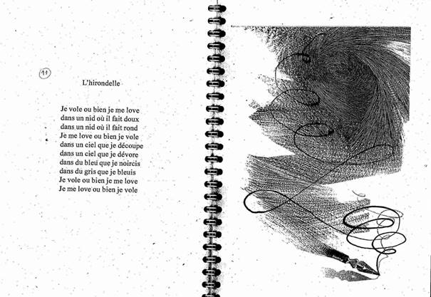 Les poèmes « L’hirondelle » (n°11) et le poème n°16, dont les premiers vers sont « Ne rosse pas / les passereaux », tous deux fondés au départ sur un jeu d’inversion ou de verlan – lover / voler – pour « l’hirondelle » rendent hommage à la liberté, la grâce de l’oiseau qui invite au voyage, à la contemplation et peut-être aussi à l’écriture poétique, comme y insiste l’illustration de V. Boiry pour « L’hirondelle ».