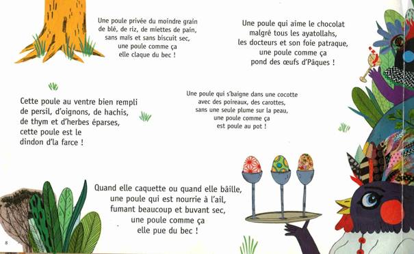 Dans ce recueil de poèmes qui prend le format d’un album à l’italienne, le poète s’empare d’expressions figurées, voire d’expressions ou de mots courants liés à la poule en particulier et à l’oiseau en général25, en les appliquant à des gallinacées dans quarante-huit courts poèmes. Ces mots ou expressions s’en trouvent alors resémantisés de manière humoristique et décalée, comme le montrent les poèmes de la page 8 :