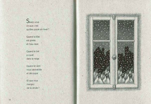 qui évoque à la fois la mort souvent tragique de la poule ou des volailles lors des fêtes de Noël en particulier, mais aussi en filigrane le sort des sans-abris dont l’exclusion est renforcée à cette époque35 ; l’illustration d’Henri Galeron avec ces poules qui regardent à la fenêtre, mais de l’extérieur, insiste bien sur ce sentiment de détresse et sur le parallèle avec les exclus.
