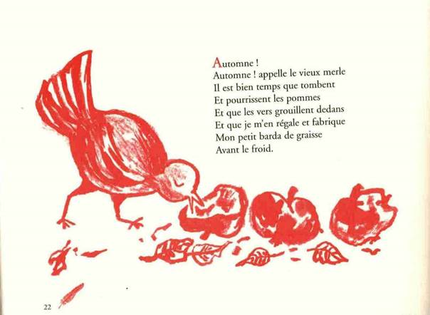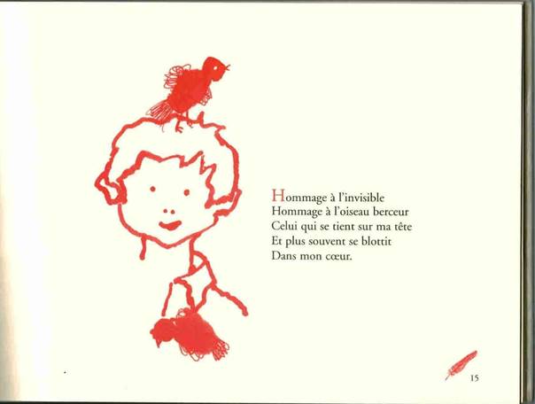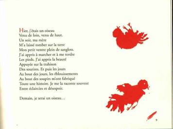 L’intérêt particulier de ce recueil de belle facture avec ses illustrations stylisées au trait rouge, jouant sur les vides et les pleins sur fond beige, se trouve dans l’analogie entre l’enfant et l’oiseau dès la page de garde46 et surtout dans le poème liminaire :
