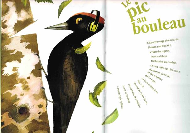 Illustration 26. Françoise Bobe, ill. Nicolas Duffaut, La pie-poète, Bayard jeunesse, 2009 : « Le pic au bouleau », p. 8-9