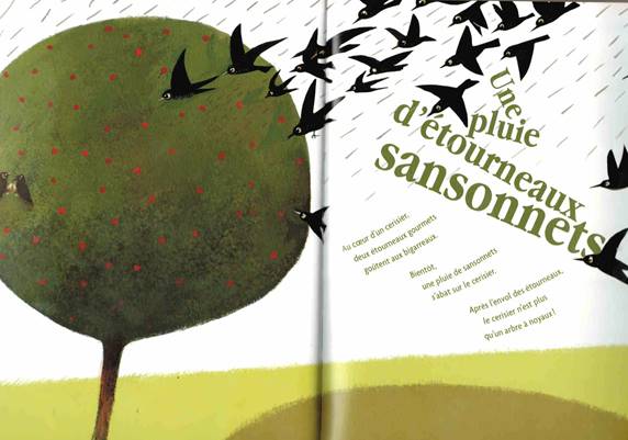 Illustration 27. Françoise Bobe, ill. Nicolas Duffaut, La pie-poète, Bayard jeunesse, 2009 : « Une pluie d’étourneaux sansonnets » p. 18-19