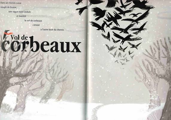 Illustration 28. Françoise Bobe, ill. Nicolas Duffaut, La pie-poète, Bayard jeunesse, 2009 : « Le vol de corbeaux » p. 30-31