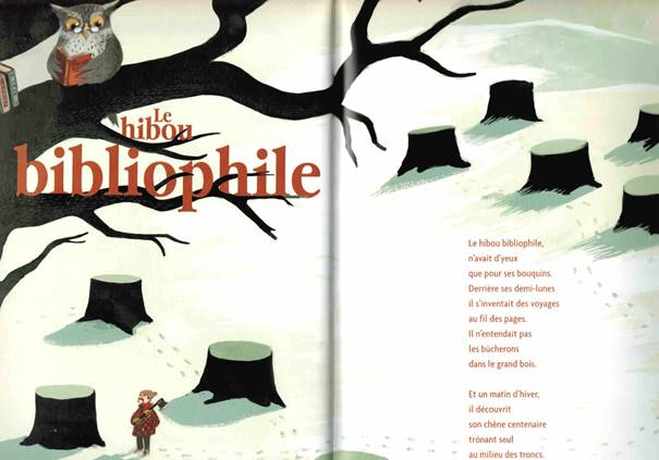 Illustration 29. Françoise Bobe, ill. Nicolas Duffaut, La pie-poète, Bayard jeunesse, 2009 : « Le hibou bibliophile », p. 23-24