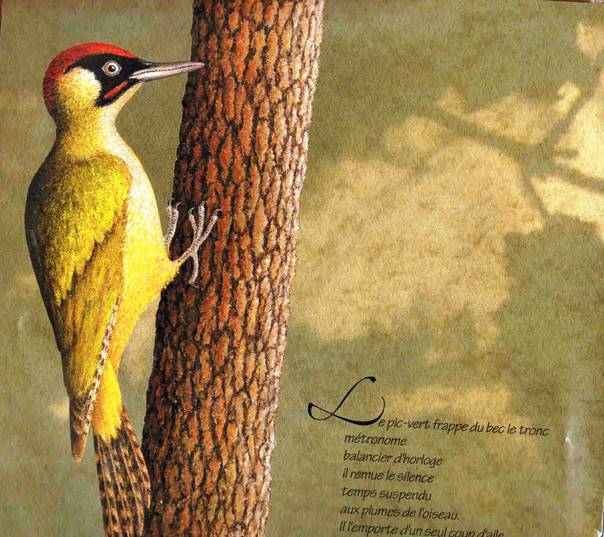 [56] Plusieurs oiseaux sont communs à cet album et à La pie-poète, comme la sittelle, le pic-vert, le héron. Une comparaison serait intéressante tant au plan des textes que des illustrations, sous l’angle de l’adaptation à l’âge du destinataire.
