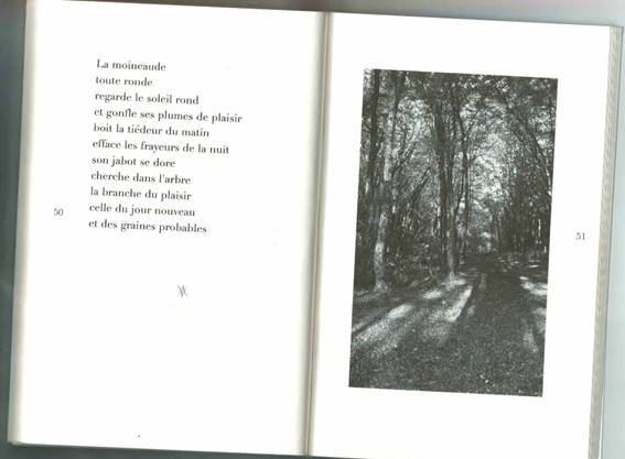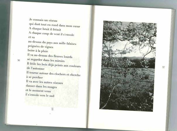 Un poème à la page 50 associe l’oiseau à un « cahier de vraies vacances », « que personne ne corrigera » et « qu’on oubliera exprès / Sous un arbre du jardin ». Le thème de la liberté et le motif du vol ou de l’envol sont d’ailleurs récurrents49. Or parallèlement, est aussi établi de manière récurrente tout un jeu de miroir entre l’oiseau et le poème ou l’écriture poétique, déjà présent dans le recueil de Michel Besnier :