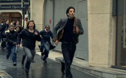 L’espace du film, constamment resserré autour de lui, enferme le personnage. Cela est particulièrement manifeste dans les plans qui, à deux reprises, le montrent tentant vainement de s’en échapper dans un mouvement de course panique (ill. 4 et 5). Là non plus, malgré la tonalité assez désespérée de la scène, le burlesque ne semble guère loin ; du moins à sa deuxième occurrence, quand le personnage se voit soudain rejoint par une horde d’adolescentes se précipitant derrière lui avec de grands cris joyeux. Qui a vu Fiancées en folie (Seven Chances, 1925) ne manque de se remémorer Buster Keaton poursuivi de façon assez similaire par une multitude féminine en délire.